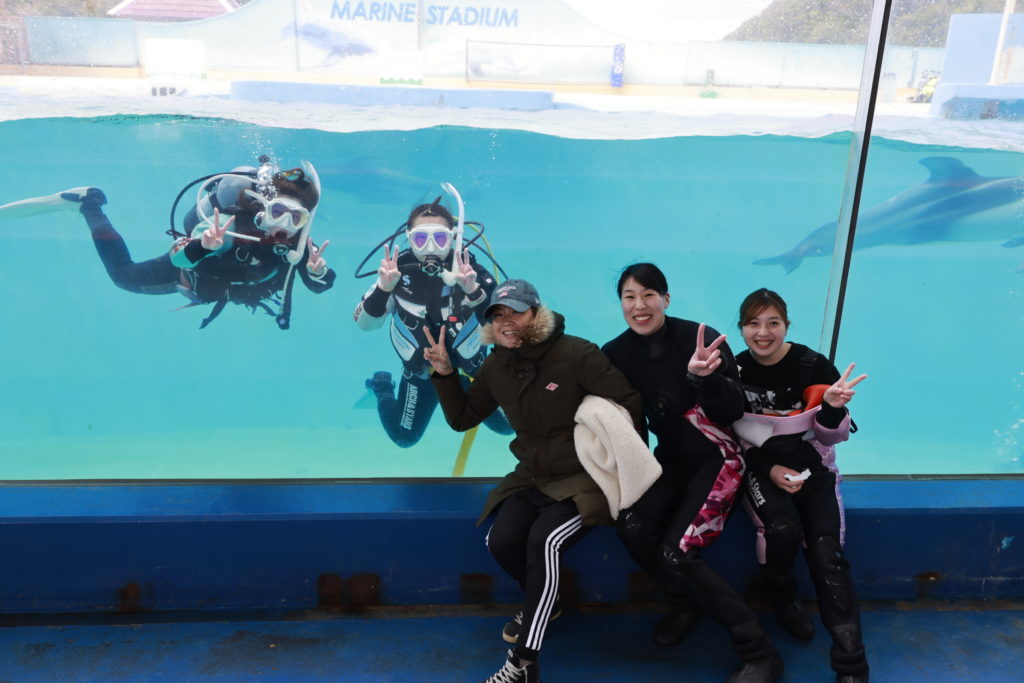 好奇心旺盛なイルカ達は、周りをグルグル回ったり正面から覗き込んできたりと終始手が届くところで一緒に遊んでくれます。潜る場所は普段イルカショーを開催している大型の水槽となりますので、水深も比較的浅いため、お子様や、ダイビングライセンスがない方でも気軽に体験ダイビングができます